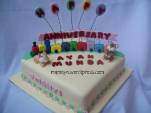 masih sama, masih pesenan mbak noni di jerman. Kali ini minta dibuatkan kue anniversary buat adiknya, tapi yang lucu karena biar 2 anaknya bisa ikutan seneng. Mintanya, ada kereta api kayu bawa banner sama 2 ekor hamster seperti binatang peliharaan darrel sama adek awa… itulah dia hasilnya… dekorasinya, semua fondant…