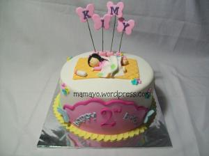 Ibu Yola di Bintaro order buat HUT Kimy yang ke 2. Maunya ada bayi lagi tidur sama banyak kupu-kupu. Warnanya minta yang soft aja.