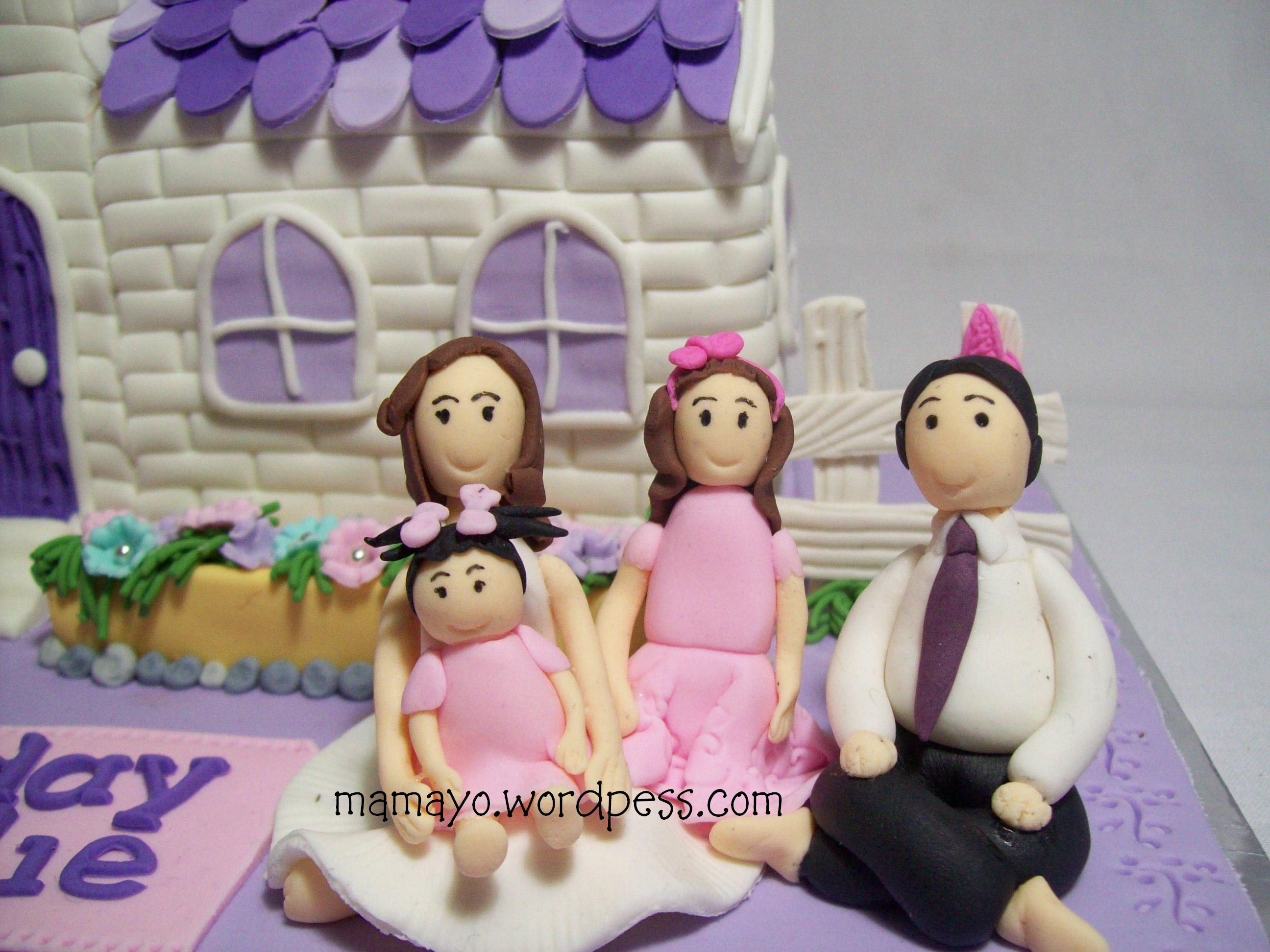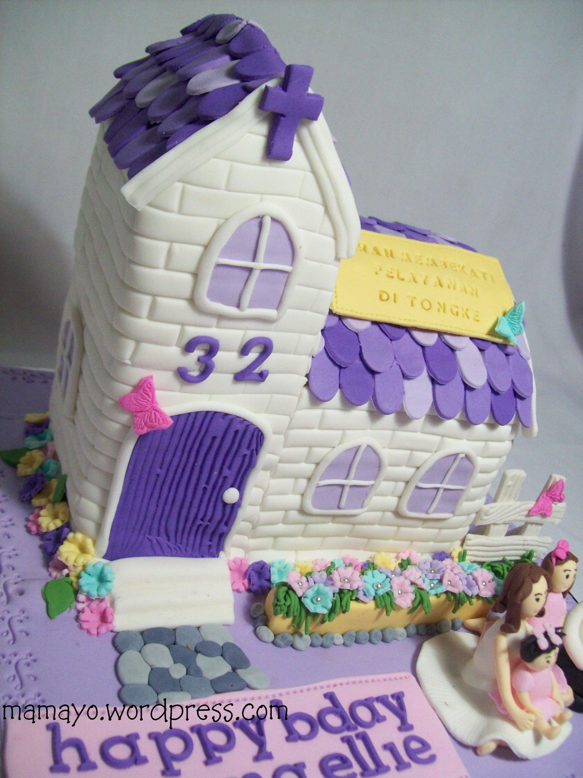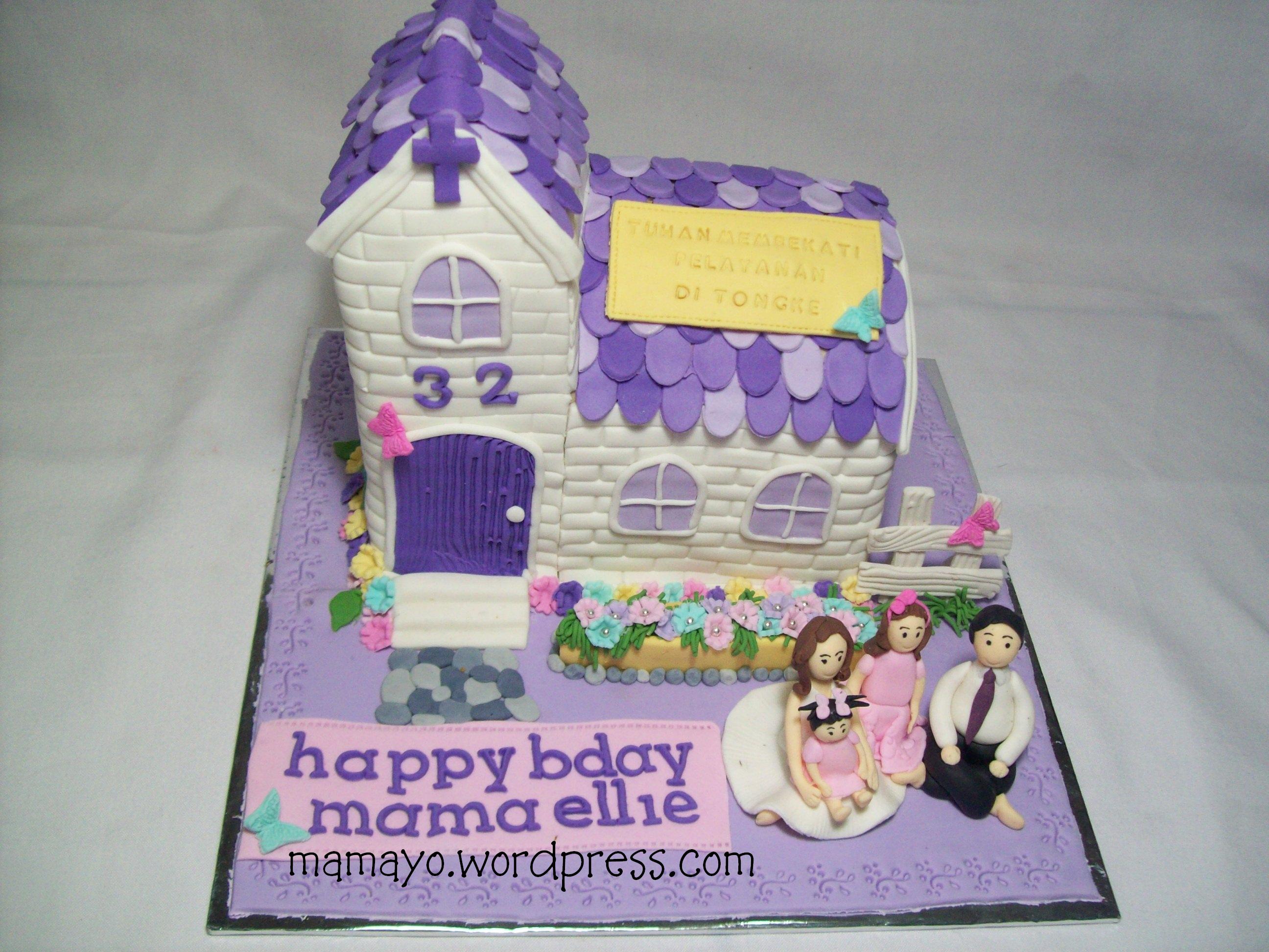 repeat order yang kesekian kali dari mbak sigrit… thanks ya mbakk dah percaya sama aku…. Kali ini kue buat kakaknya. Awalnya cuma minta kue nuansa ungu dan sedikit banget hijau. Dengan 4 figur kakak, kakak ipar dan dua putri cantiknya. Dan suaminya mau pindah pelayanan di tongke.. Jadilah aku buat kue berbentuk rumah gereja… dan 4 figur didepannya..