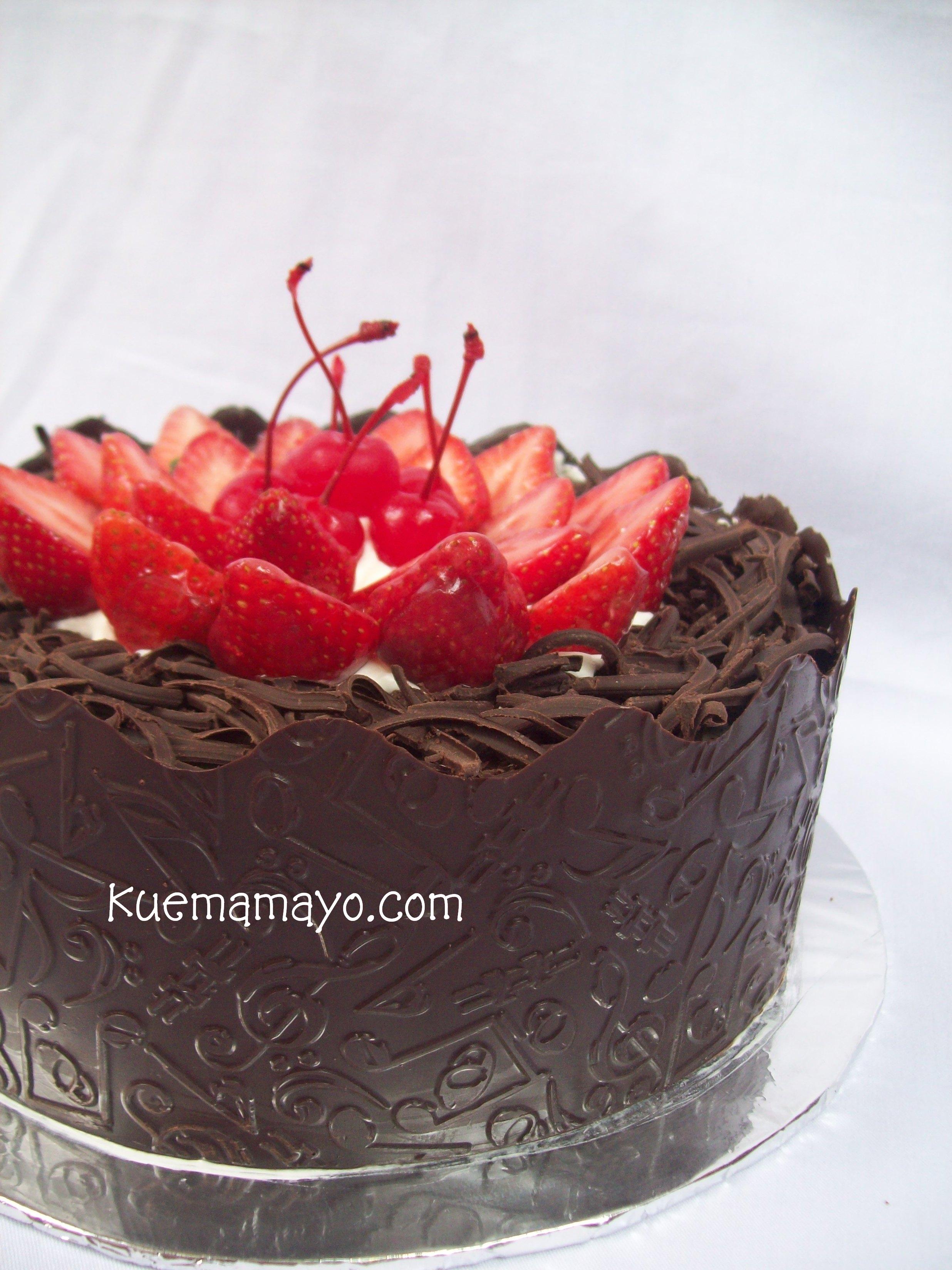 Untuk Ultah mimam. Kue double coklat. Cake coklat filling coklat yang pasti rasanya ueennnaakkk….. Hiasan sederhana dari stawberry dan cherry juga, pagar coklat bermotif not menemani kue coklatnya. Happy b’day ya mam….