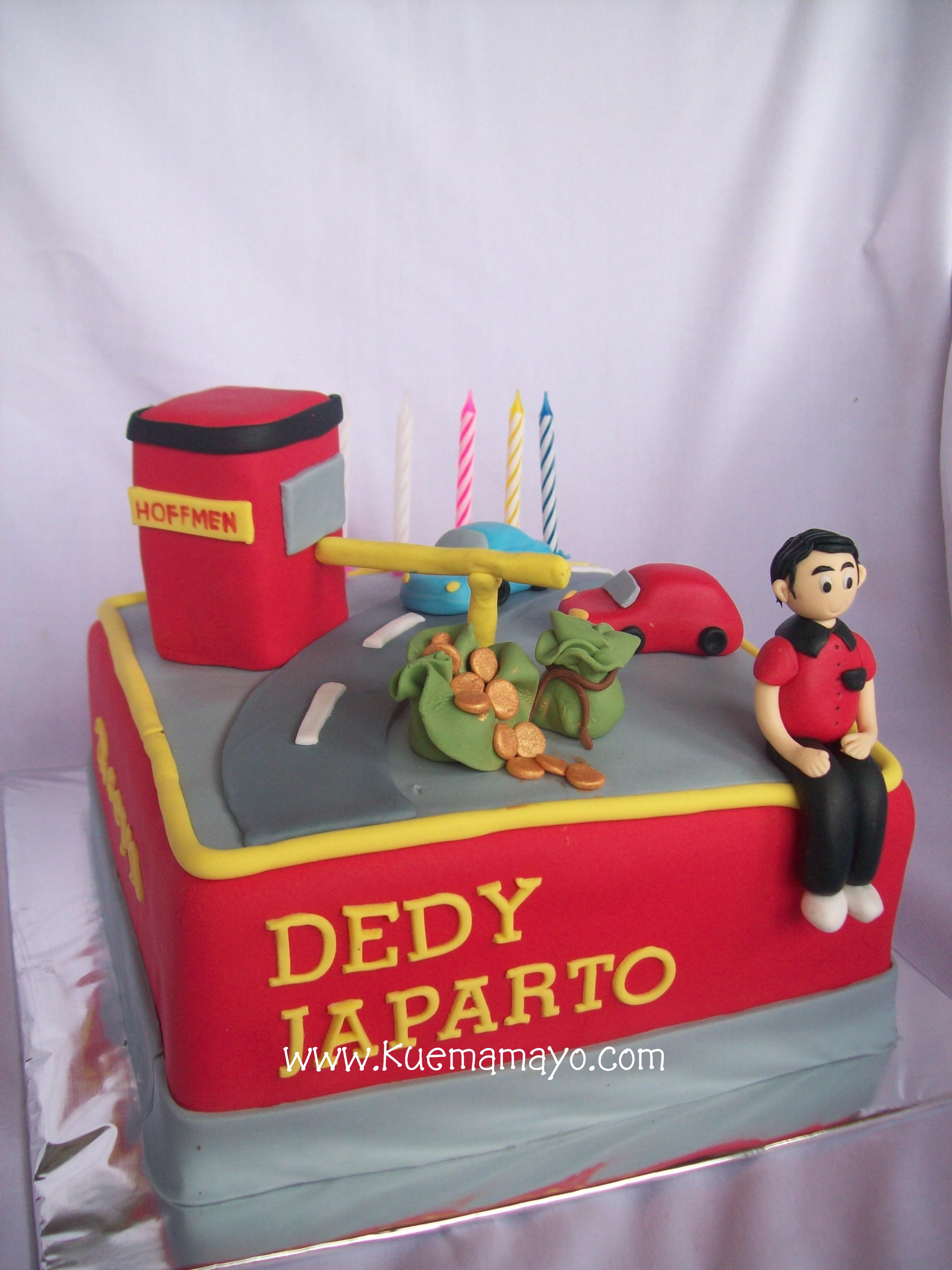 Ordernya kue dengan figur orang pake baju seragam parkirnya, Pos dan palang pintu parkirnya, beberapa mobil parkir, dan jangan lupa pundi-pundi uang emas…. Kuenya dasarnya warna merah ya mbak…. kata ibu Vellin.