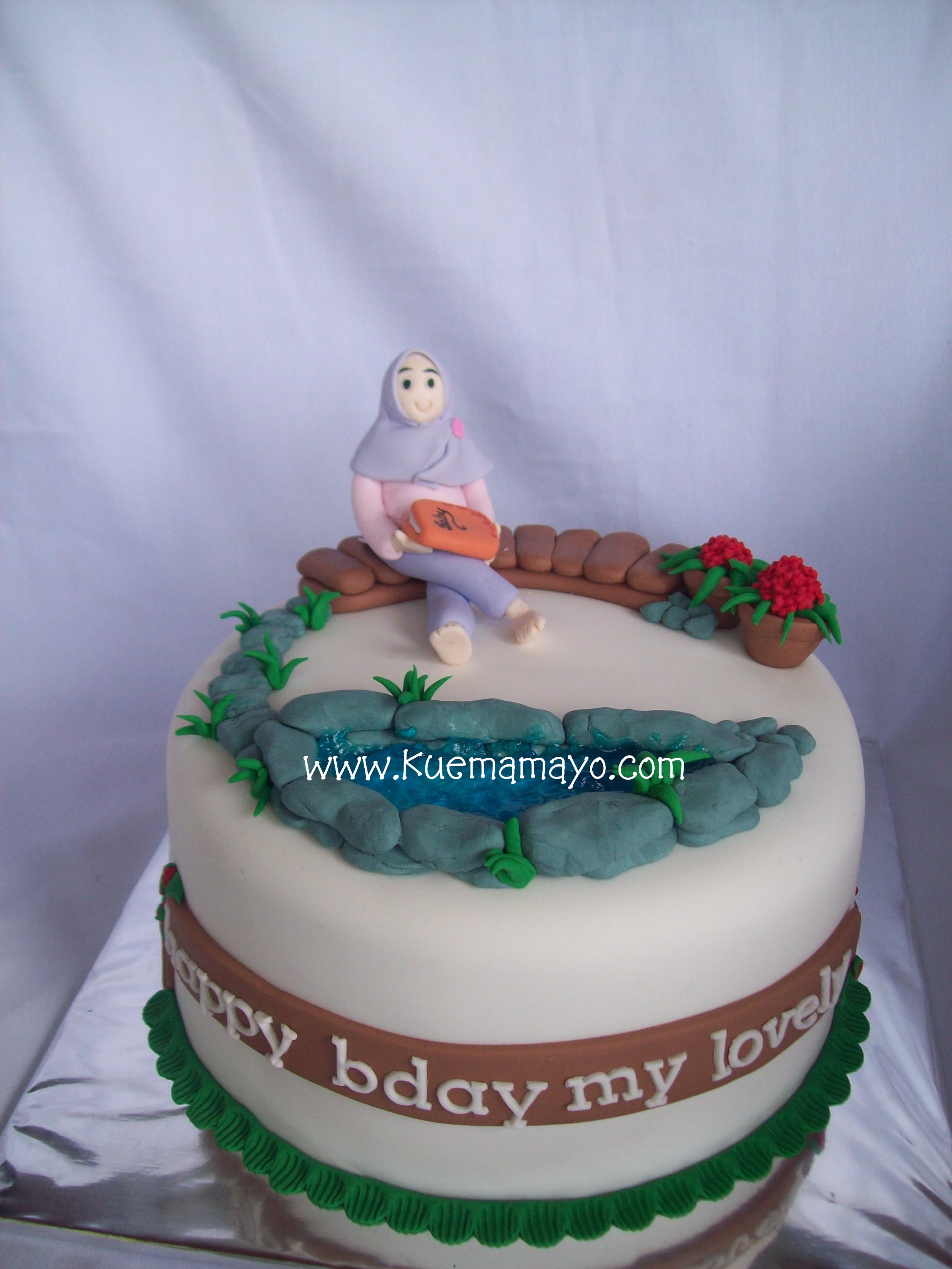 Kue sacher torte beukuran 20 cm ini dipesan oleh Bapak Wahyu di Pasar Rebo untuk ulang tahun istrinya. Dijelaskan di email bahwa istrinya sedang hamil, berkerudung, dan minta duduk di taman sambil pegang buku tentang bayi..