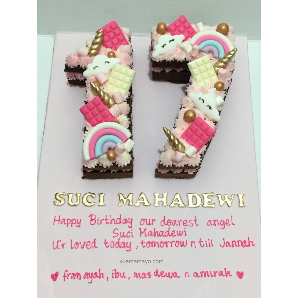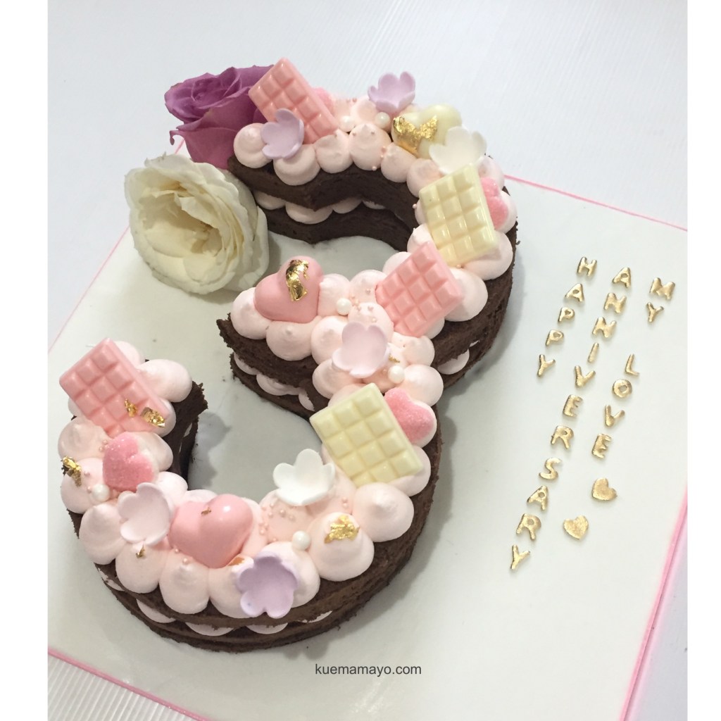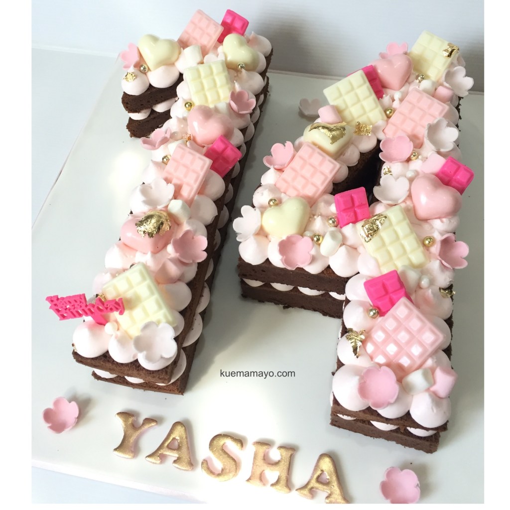 Kue yang dibetuk huruf atau angka, bisa rasa coklat atau vanilla dengan hiasan dari white choco ganache, juga coklat praline dan sedikit sentuhan fondant.