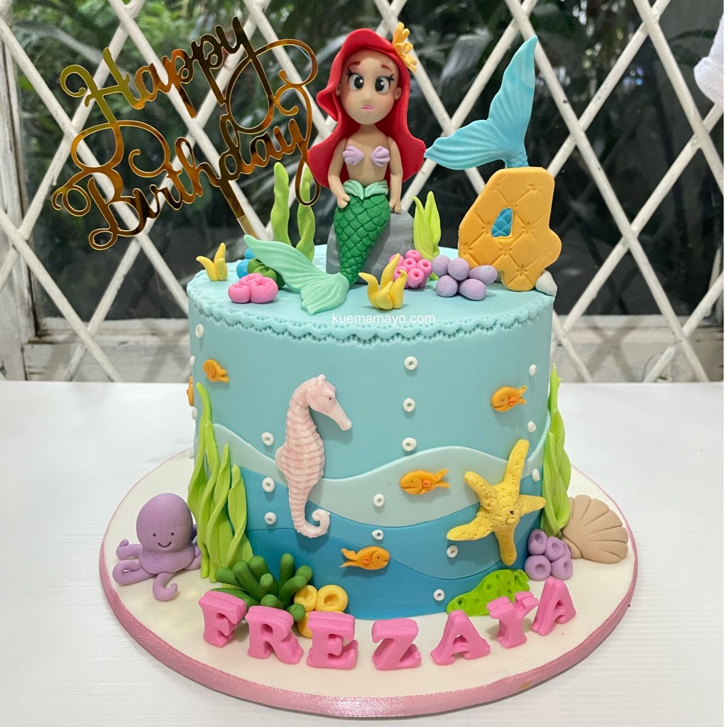 Kue bertema mermaid ini berukuran diameter 16 tinggi 12cm. Berisi kue coklat dengan filing dan frosting coklat. Cover kue dan semua hiasannya menggunakan fondant
