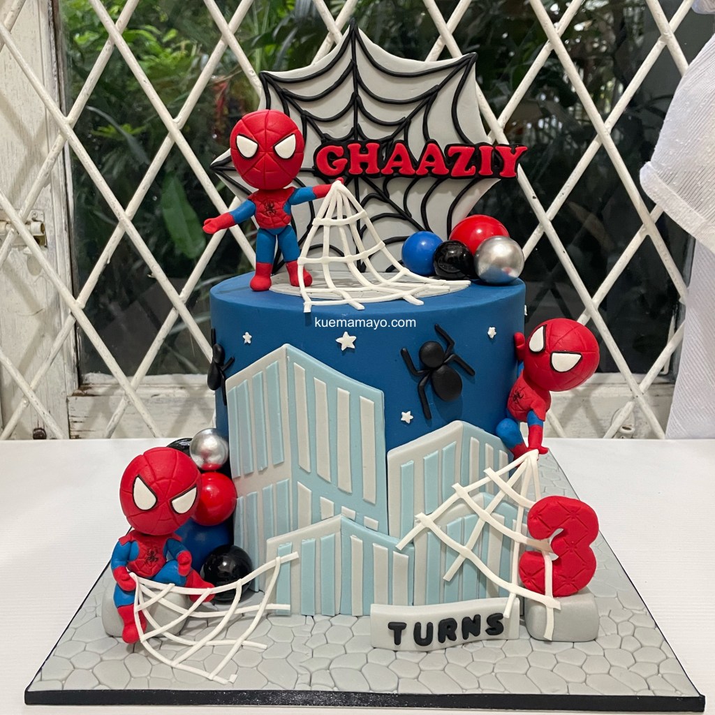 Kue bertema spiderman ini berukuran diameter 18cm dengan tinggi 15cm. Cover fondant, figur fondant dengan isi cake coklat yang filling dan frostingnya menggunakan ganache coklat