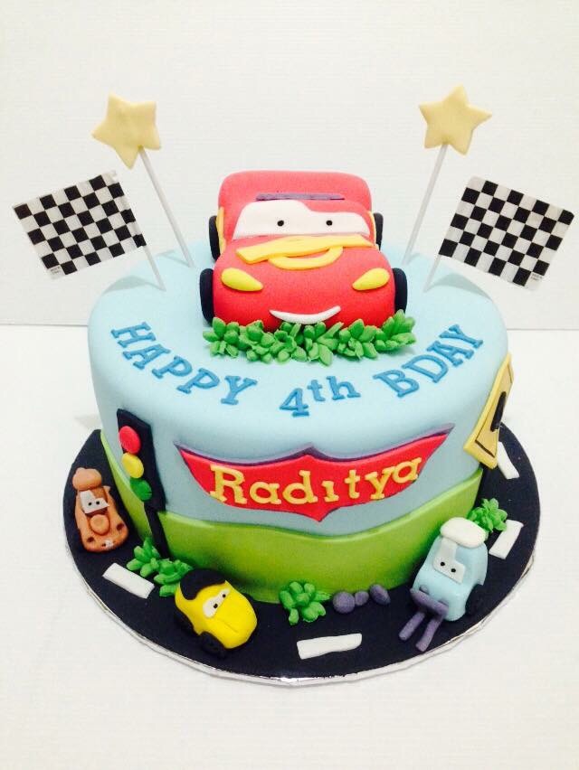 Kue mc queen ini dibuat dari diameter 20, mc queen dalamnya berisi kue dilapis fondant. Dekor dan figurine terbuat dari fondant