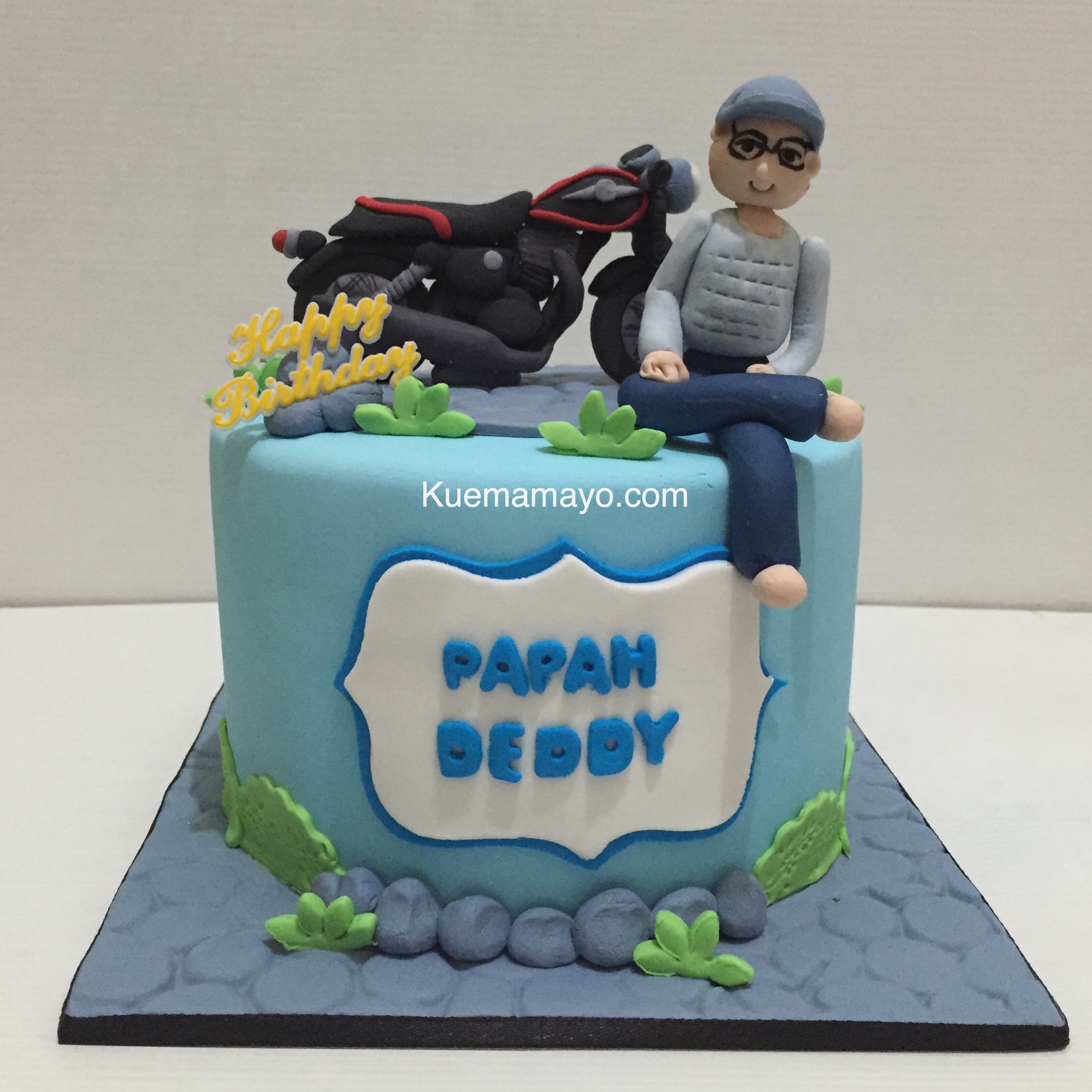 Kue bertema motor, ukuran kecil diameter 16cm dihias fondant dengan isi triple chocolate cake. Figur motor dan orang dari fondant