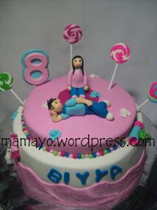 request kakak biyya untuk ultahnya kali ini kue dengan fondant dan ada permen-permennya… Thanks buat om pipi yang udah mau bikinin kakak biya bunder-bunder warna warni.. Trus ada request dari adek abi.. minta ditambahin figurnya yang lagi tiduran dengan rambut jegriknya hahaha…
