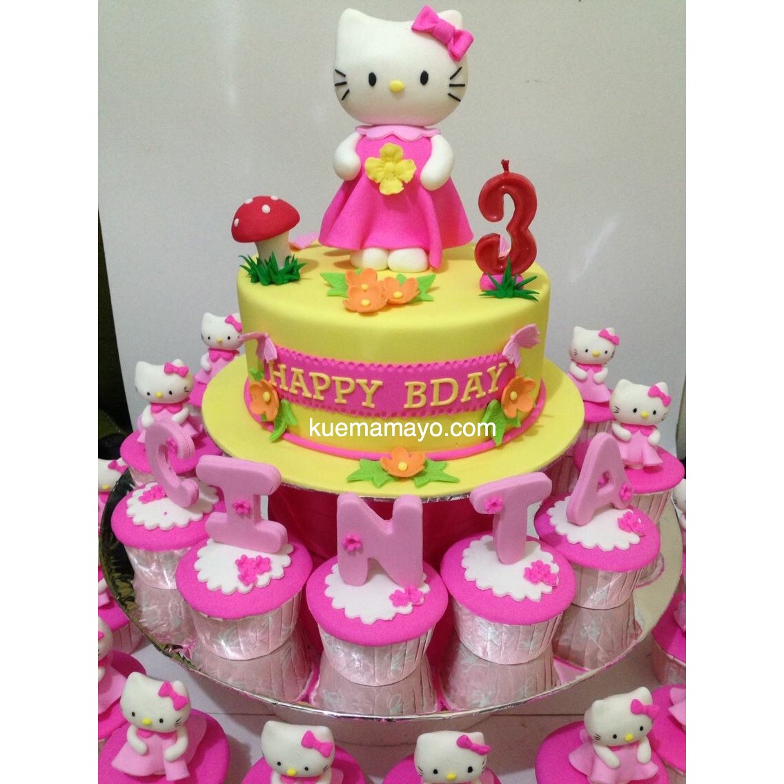 Kue bertema hello kitty ini, dibuat dari ukuran kue diameter 20cm. Dengan 6 cupcake. Karakter dan dekorasinya menggunakan fondant icing