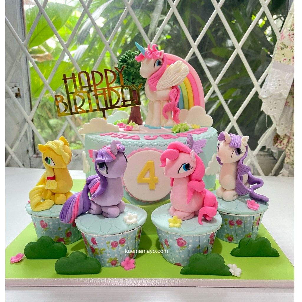 Kue coklat berdiameter 16cm dan 4 cupcake yang dihias bertema little pony dengan figur pony yang dibuat dari fondant. Jadi semua karakternya bisa dimakan