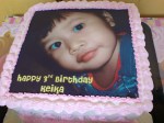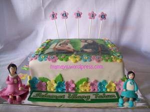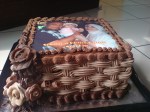 Kue Ulang tahun ini, dipesan sama adik iparku, untuk tantenya. Yang kecil itu foto kika waktu masih 7 bulan. Mbak Lutik pengen pake edible, jadinya cari-cari foto ‘neh elly yang bareng kika, tapi dapetnya cuma waktu kika kecil. Kali ini maunya, nuansa coklat aja. Tidak warna-warni kaya punya kika pas ultah yang ke 3 tahun. Jadi semuanya pake coklat. cake coklat, ganache siram coklat, butter cream campur coklat leleh dan fillingnya coklat plus cerry hitam.