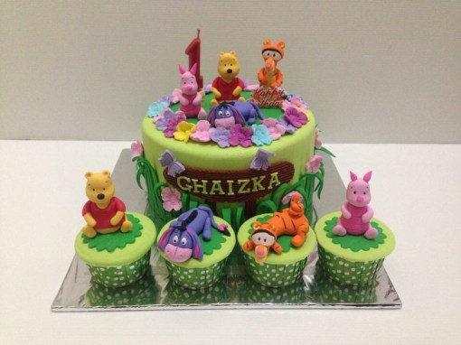 Kue tema winnie the pooh and friends ini berdimeter 20cm dan 4 buah cupcake 3 dimensi.