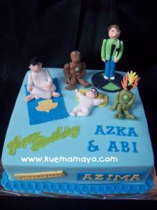 Kue ini pesanan mama azka, yang kemaren pesan kue ultraman hehehe… mama azka pesan lagi kue dengan tema, ben 10, ayah yang sholeh dan new baby born Azima… jadilah kuenya demikian