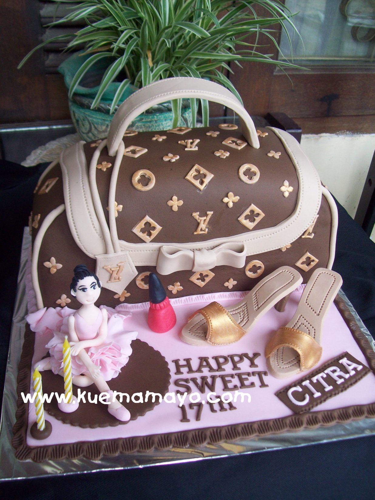 Minta kue ultah bentuk LV bag cake, ada figur penari dan juga high heels… Bikin tasnya pake kerajinan tangan, soale logo-logonya nggak pake edible photo, dibikin sendiri dari fondant, dan lamaaa ternyata.