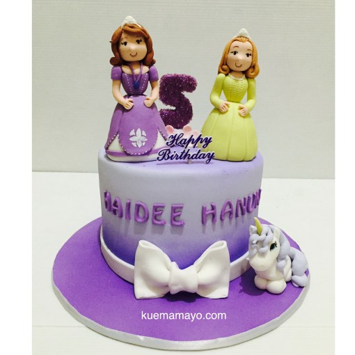Kue bertema sofia the first, dominasi warna ungu sesuai dengan pakaian sofia. Semua figurin dari fondant